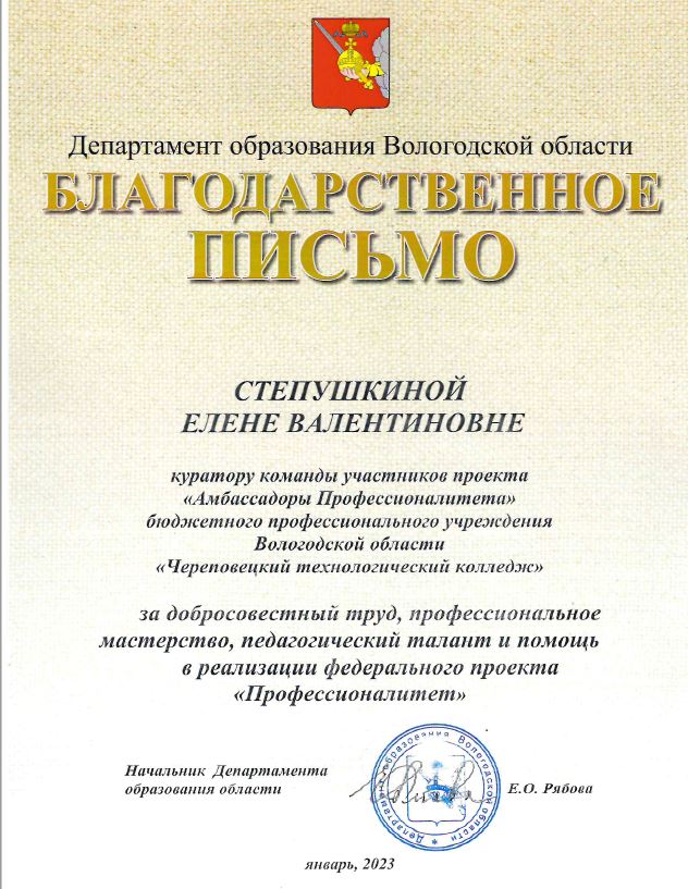 Степушкиной Е.В., благодарность
