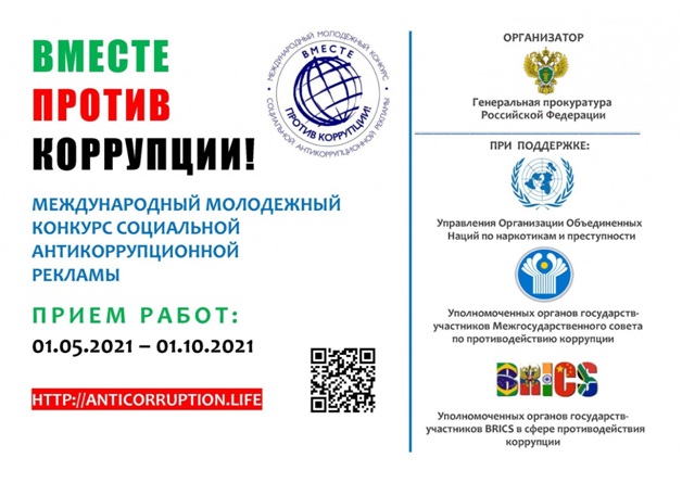 В 2021 году Генеральная прокуратура РФ проводит Международный молодёжный конкурс социальной антикоррупционной рекламы «Вместе против коррупции!» для молодёжи из всех государств мира.