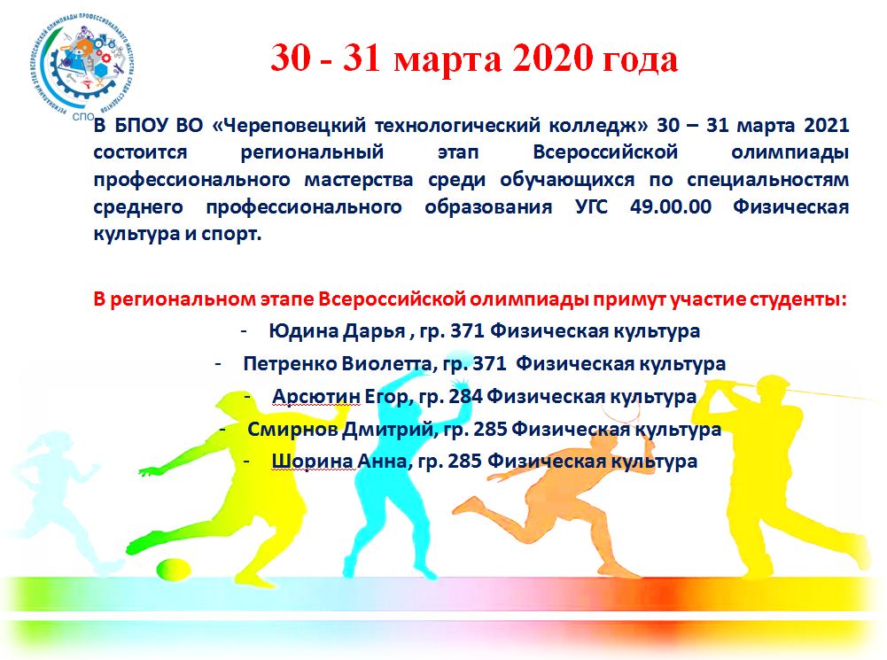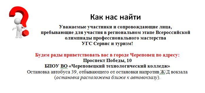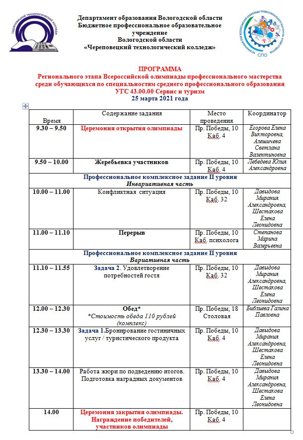 25 марта 2021 года на площадке БПОУ ВО «Череповецкий технологический колледж» состоится региональный этап Всероссийской олимпиады профессионального мастерства среди обучающихся по специальностям среднего профессионального образования УГС 43.00.00 Сервис и туризм.